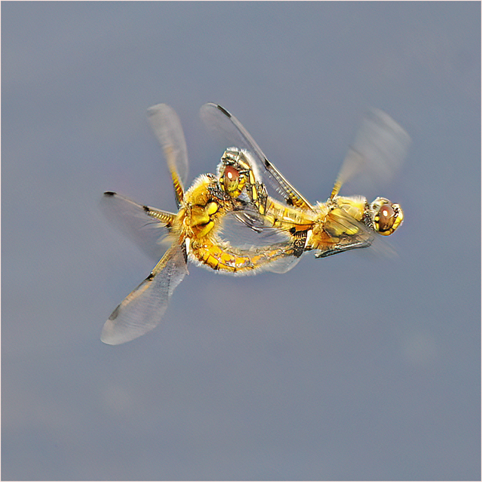Four-spotted chasers mating in flight by Ann Smith.