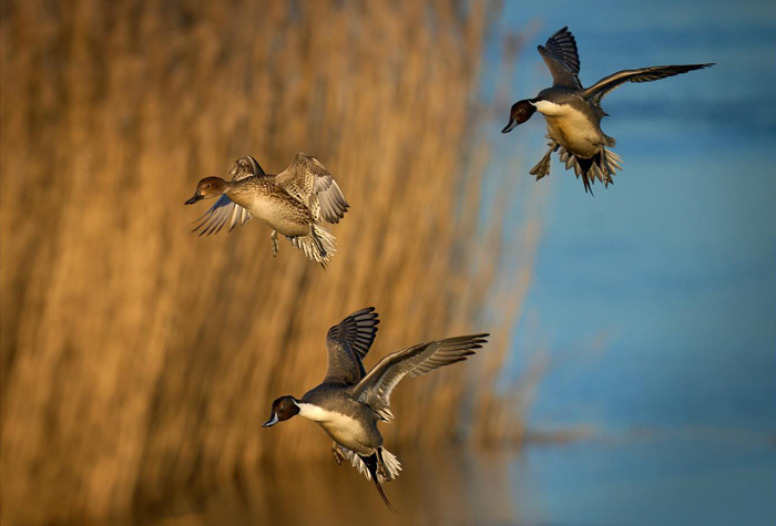 Pintail ducks arriving at evening sunlight by Tim Cheshire.